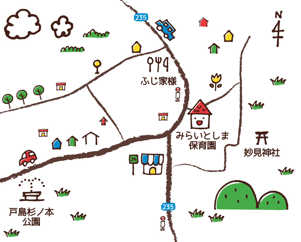 みらいとしま保育園 〒861-8042 熊本市東区戸島本町8-8 TEL.096-285-5557 FAX.096-285-5686 e-mail.mirai-toshima@kxb.biglobe.ne.jp 自動車の場合 戸島三差路から235号線を託麻東小方面へ車で1分