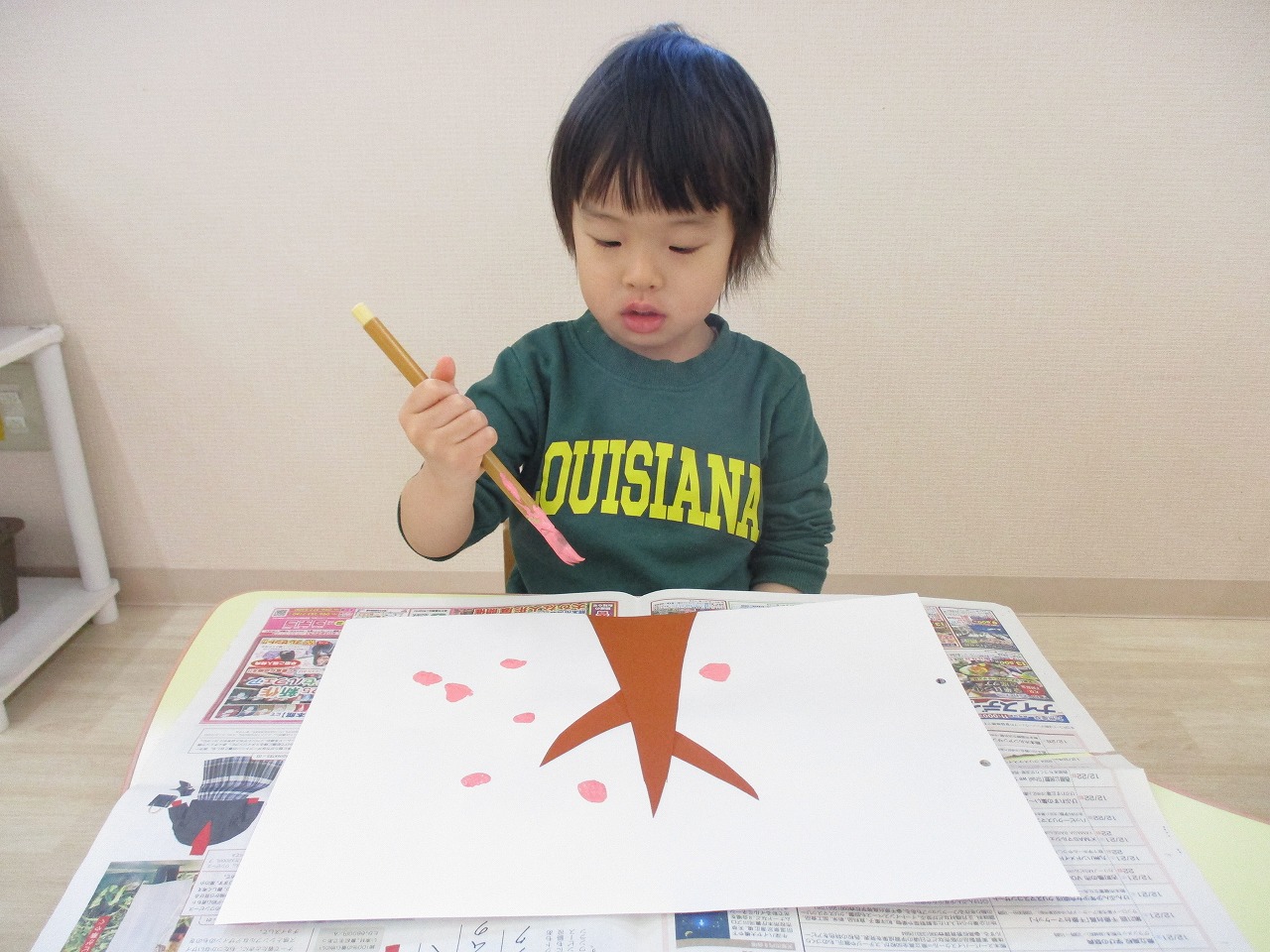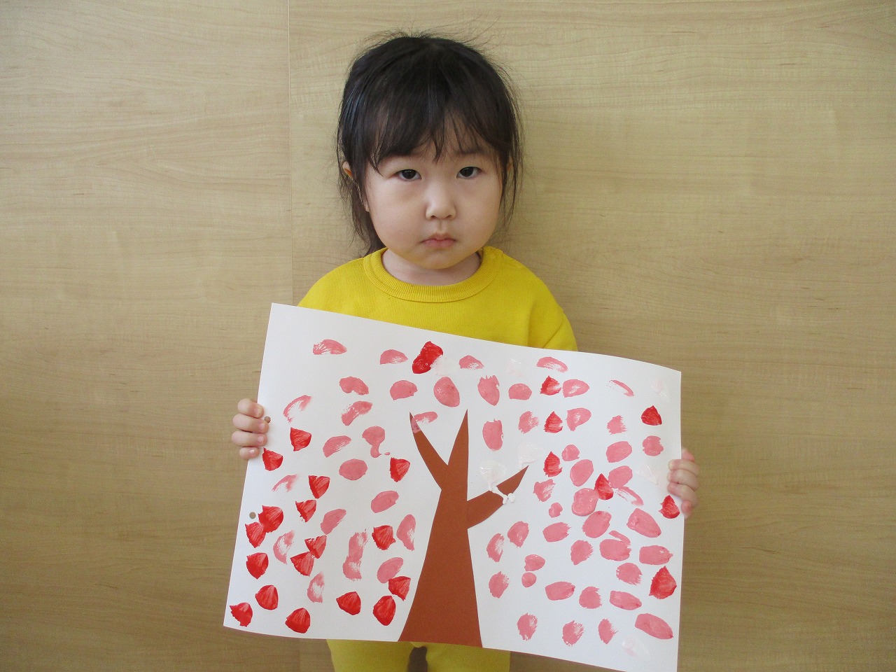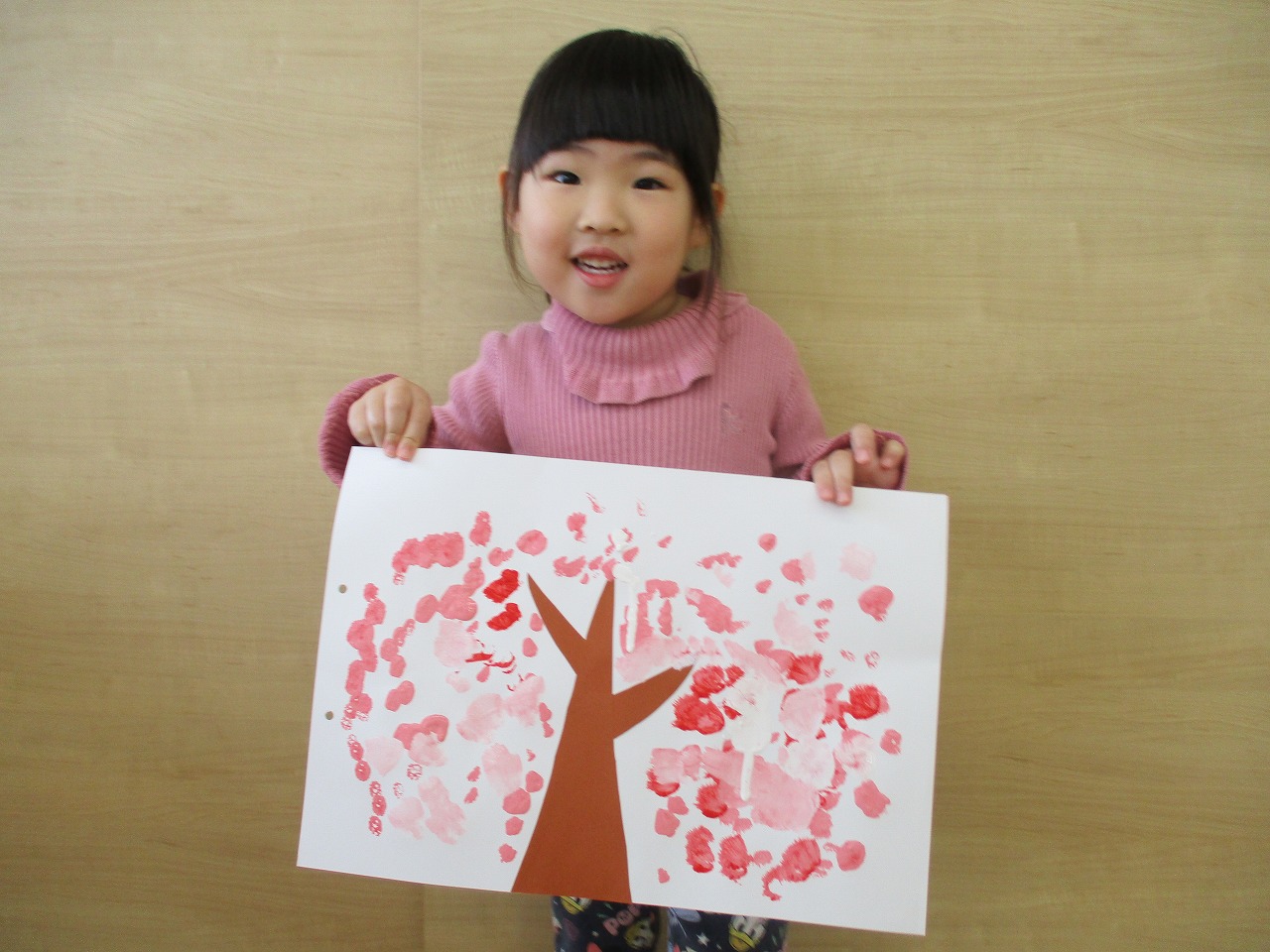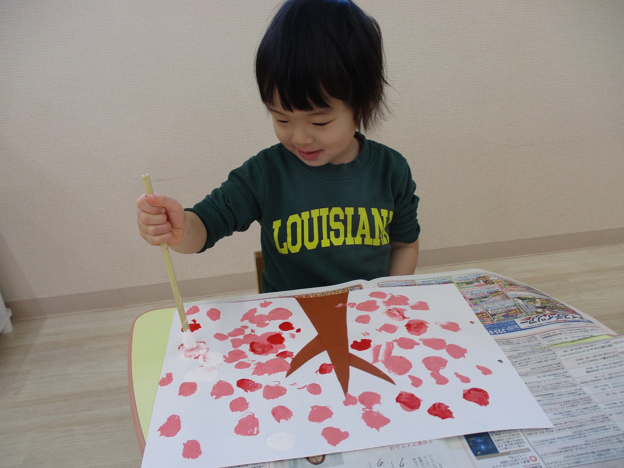 きりん組 3月の制作🌸 今月のきりん組さんの制作は 桜の木です🌸 絵の具を使って、 桜の花びらを表現します!! ちょんちょん…と筆を動かし、 桜の花びらを咲かせていきます(*^^*) ピンク、白、赤と色を重ねていきました♪ 満開の桜の木が完成しました!! きれいな桜が咲きました🌸✨