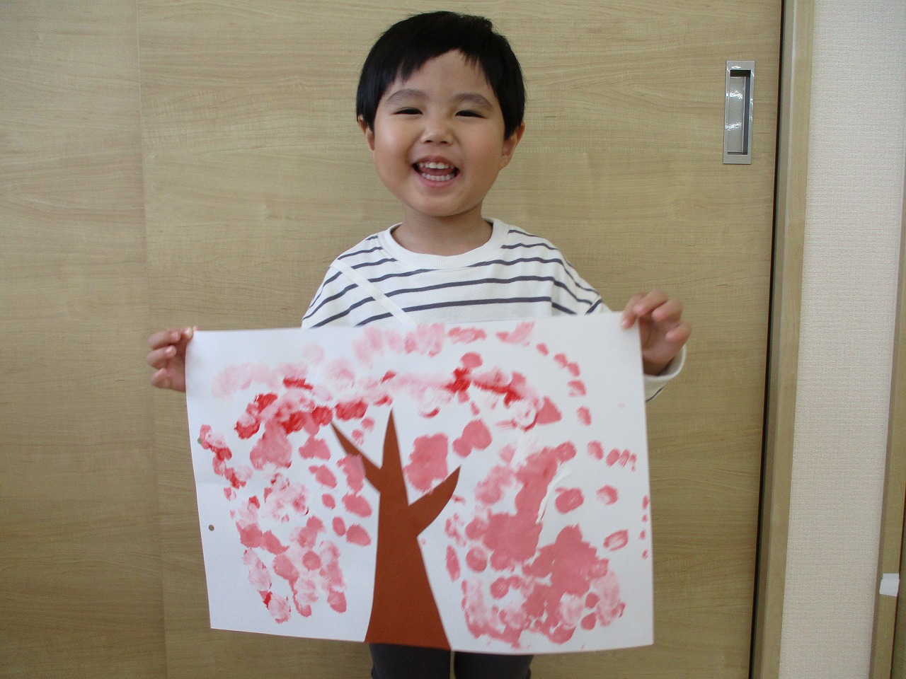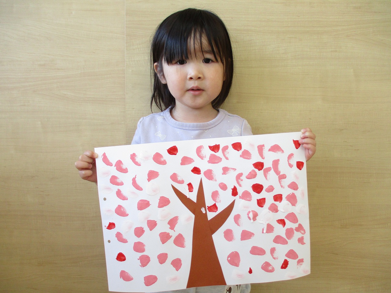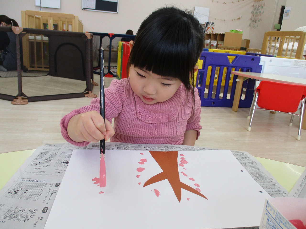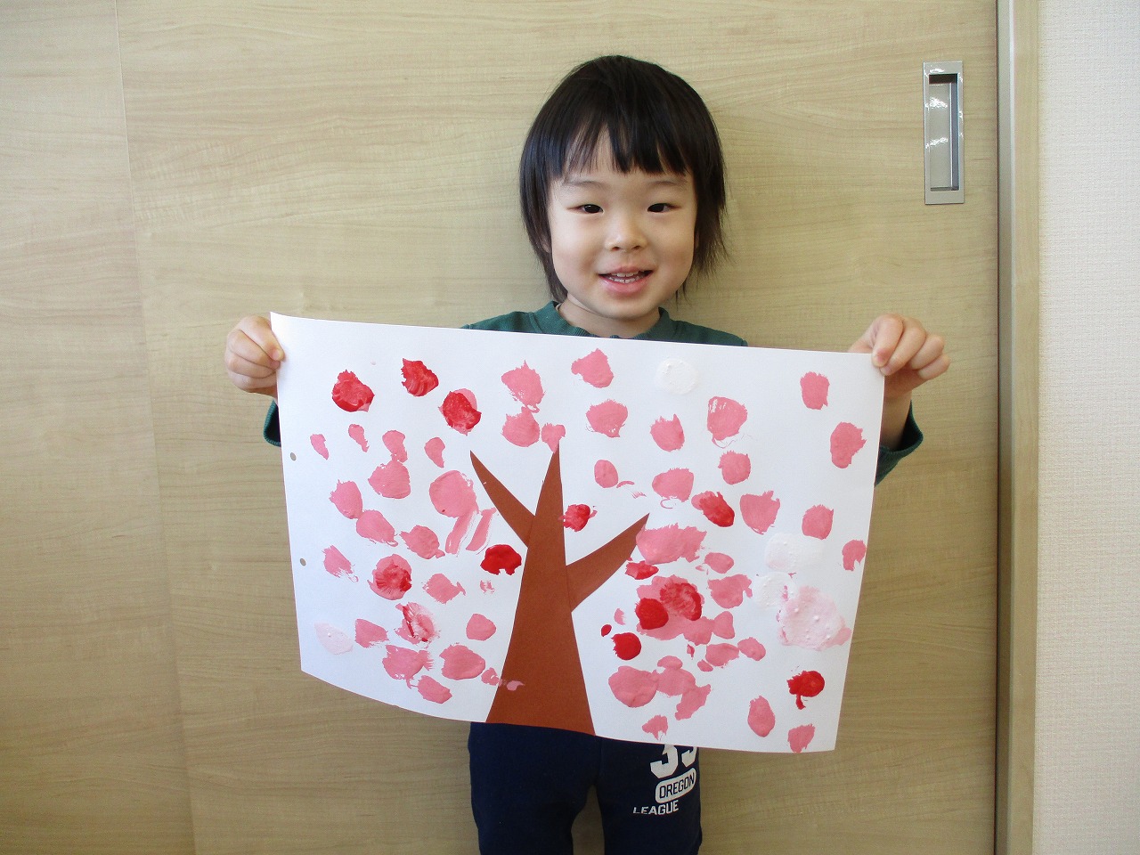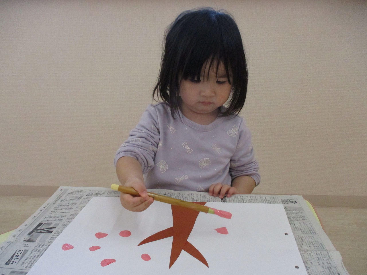 きりん組 3月の制作🌸 今月のきりん組さんの制作は 桜の木です🌸 絵の具を使って、 桜の花びらを表現します!! ちょんちょん…と筆を動かし、 桜の花びらを咲かせていきます(*^^*) ピンク、白、赤と色を重ねていきました♪ 満開の桜の木が完成しました!! きれいな桜が咲きました🌸✨