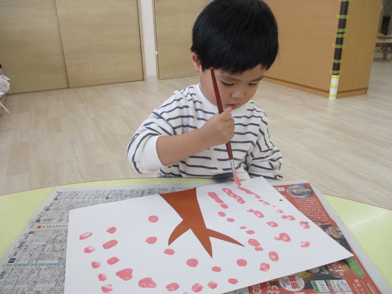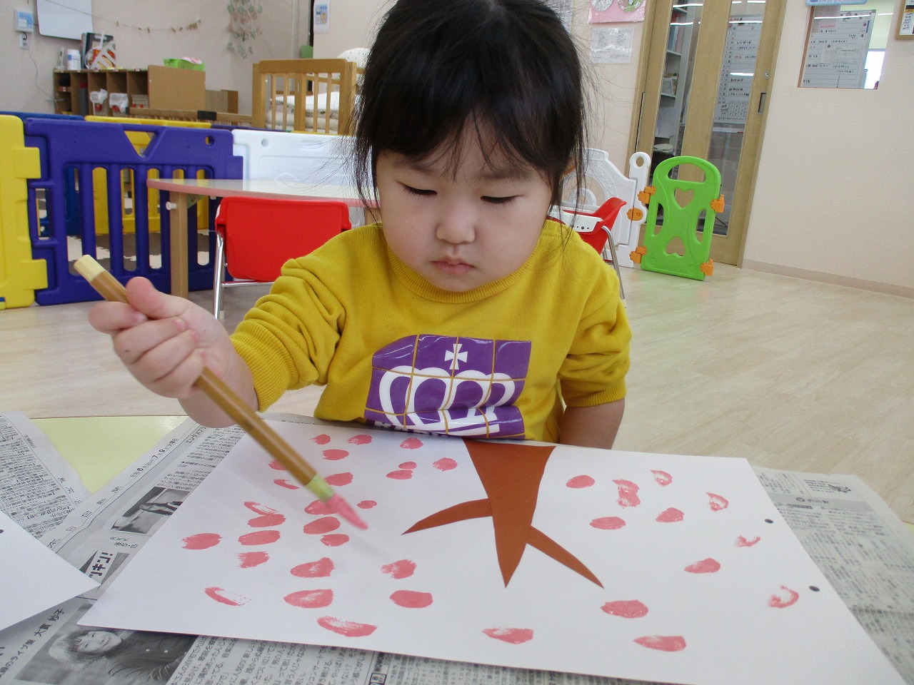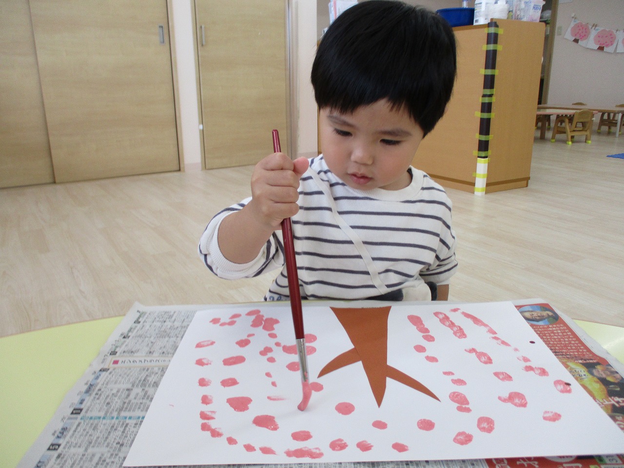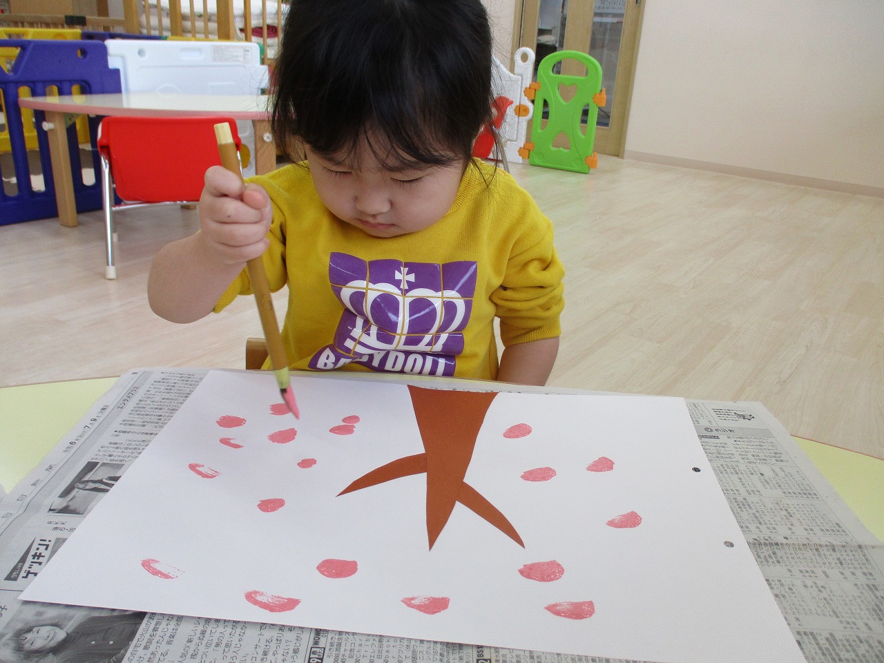 きりん組 3月の制作🌸 今月のきりん組さんの制作は 桜の木です🌸 絵の具を使って、 桜の花びらを表現します!! ちょんちょん…と筆を動かし、 桜の花びらを咲かせていきます(*^^*) ピンク、白、赤と色を重ねていきました♪ 満開の桜の木が完成しました!! きれいな桜が咲きました🌸✨